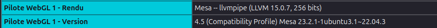 Si comme sur la capture d'écran, il est affiché llvmpipe à la place du nom de la carte graphique, cela signifie que le navigateur rencontre des soucis pour mettre en place l'accélération matérielle NVIDIA.