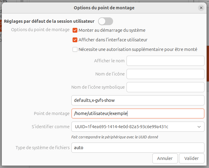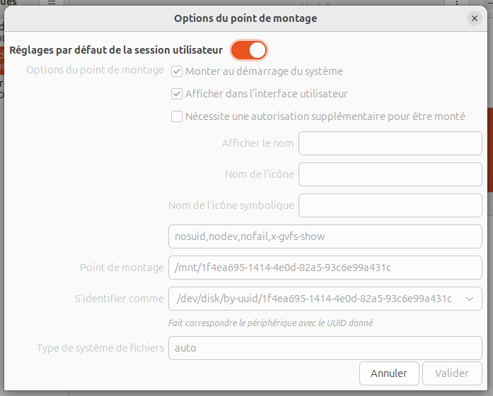 nosuid,nodev,nofail,x-gvfs-showpardefaults,x-gvfs-showce qui permet respectivement de charger la partition au démarrage et de la rendre visible - Passer l'option de