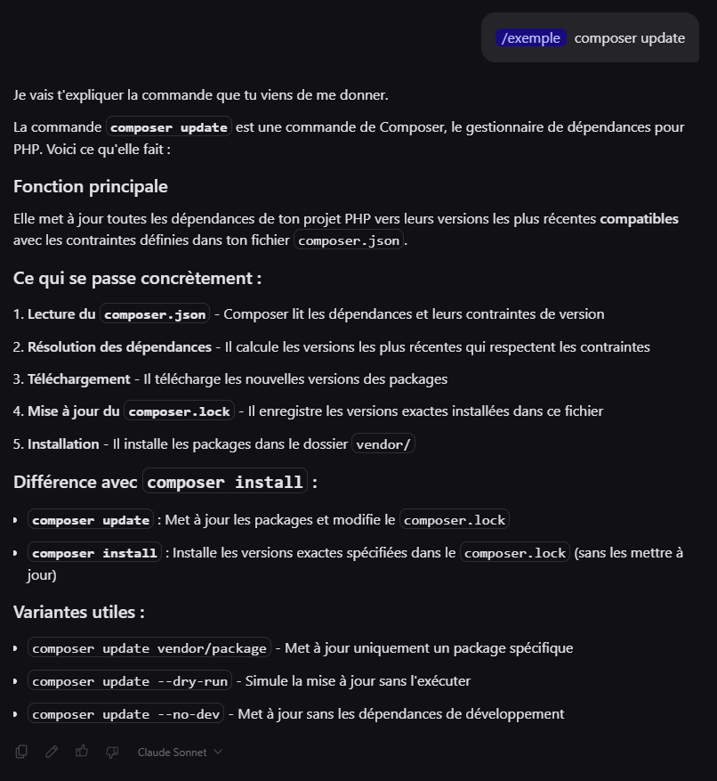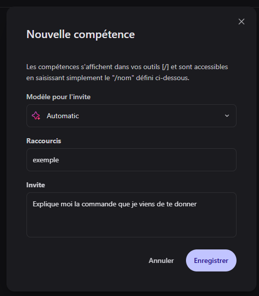 Pour ajouter un raccourci, il suffit de taper /, de sélectionner Ajouter et d'entrer le modèle, le nom de la commande à utiliser et le contenu de celle-ci ce qui donne par exemple :