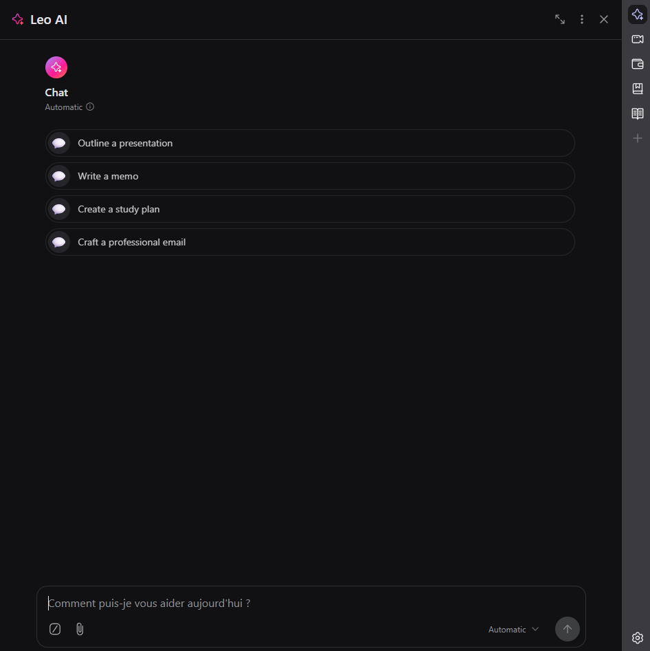 Par défaut, Leo AI est disponible dans le coin supérieur droit de l'écran, une fois ouvert le résultat est le suivant :