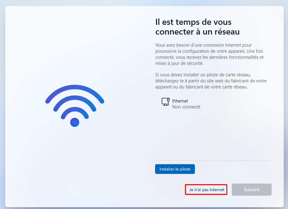 Il y a une nouvelle option que ne propose pas l'installateur en temps normal qui est "Je n'ai pas Internet" qui permet de continuer en étant déconnecté.